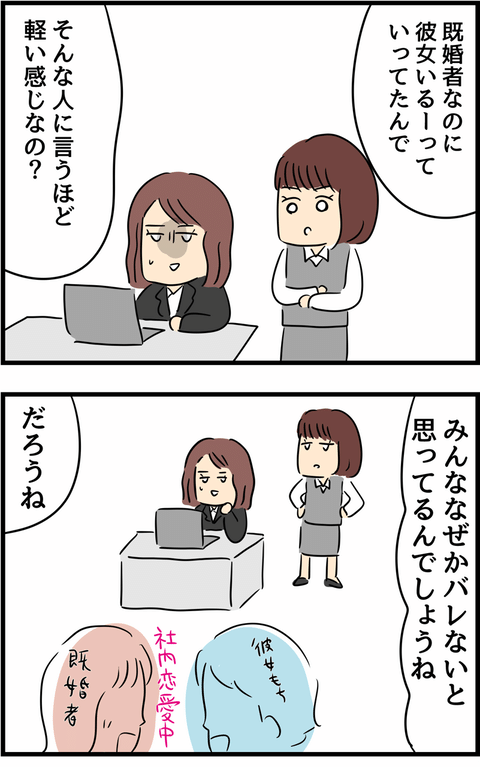 休みが明け、会社に戻った妻リナ。もしかしてあの人も、この人も、浮気してるのかも…。周りを見渡し、疑心暗鬼にかられるのでした。