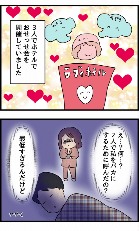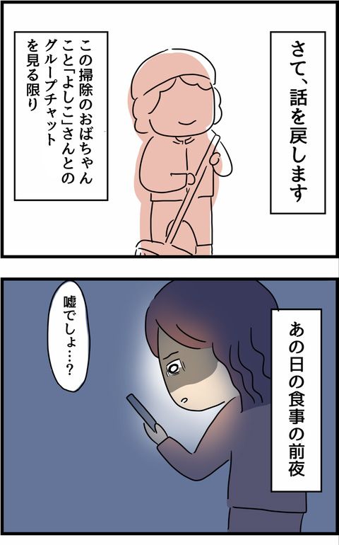 夫とその同僚かずき君と3人で食事することになった妻リナ。いつもとは違う2人の振る舞いと、話題に出た「よしこ」という人物が気になり…。