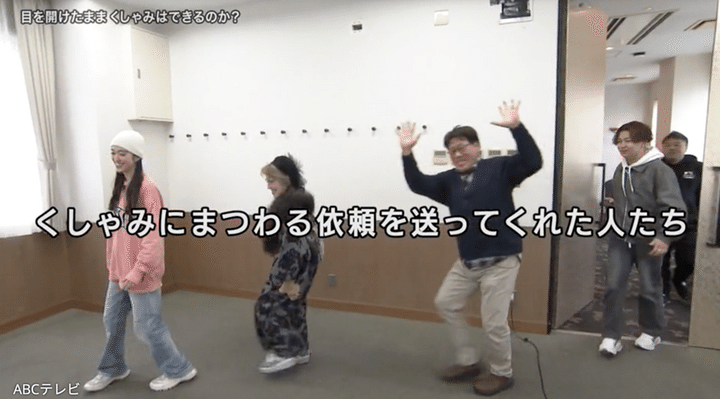そこに5人の人物が駆けつける。皆、くしゃみにまつわる依頼を番組に送ってくれた人たちだ。「日本酒を飲むとくしゃみが出てしまう人」、「チョコレートを食べるとくしゃみが出てしまう人」、「綿棒を使えば連続でくしゃみを出せる」特技の持ち主の他、過去7回も番組に出演した阪尾さんも駆けつけた。阪尾さんのこよりを使った「阪尾式くしゃみ」(2018年放送)は、番組史に残る衝撃シーンである。
