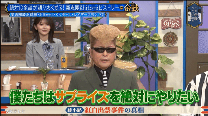 かまいたち山内が「あれはリハーサルとかせずに本番でぶち込んだ説を聞いたんですけど」と質問すると、綾小路は「僕たちはサプライズを絶対にやりたかった」と話し、「あの時代の紅白って必ず新聞記者やカメラも入っててリハーサルも全部映すんですよ。むしろそれを新聞で煽っていって当日観てもらう。あれが当時どうしても耐えられなくて。それをお話して理解してもらってたんで、いつも僕たちの演出の時には報道のカメラマンもカメラを下ろしてくれていた」と背景を説明した。