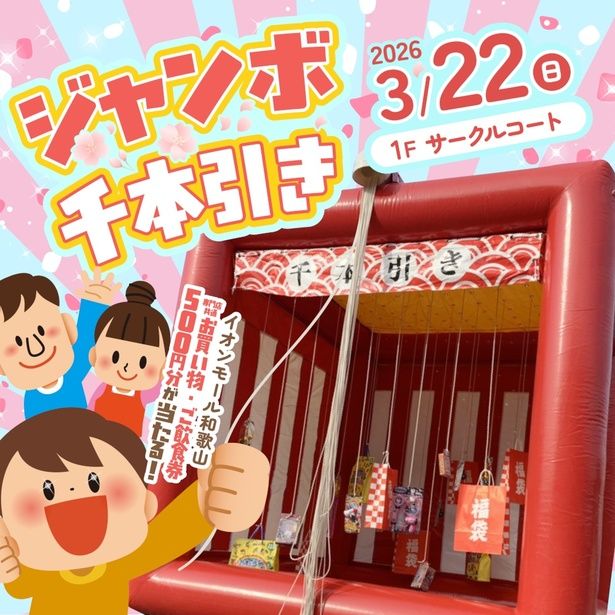 【ジャンボ千本引き】 イオンモール和歌山 1Fサークルコート / 和歌山県和歌山市ふじと台23番地 / 2026年3月22日(日) / 10:00~17:00(最終受付16:50) 景品がなくなり次第終了 / 当日イオンモール和歌山専門店で税込2000円以上購入したレシート(合算可)と、イオンモールアプリ内キッズクラブクーポンの提示が必要(1端末1回、1人1回限り) / 先着700人