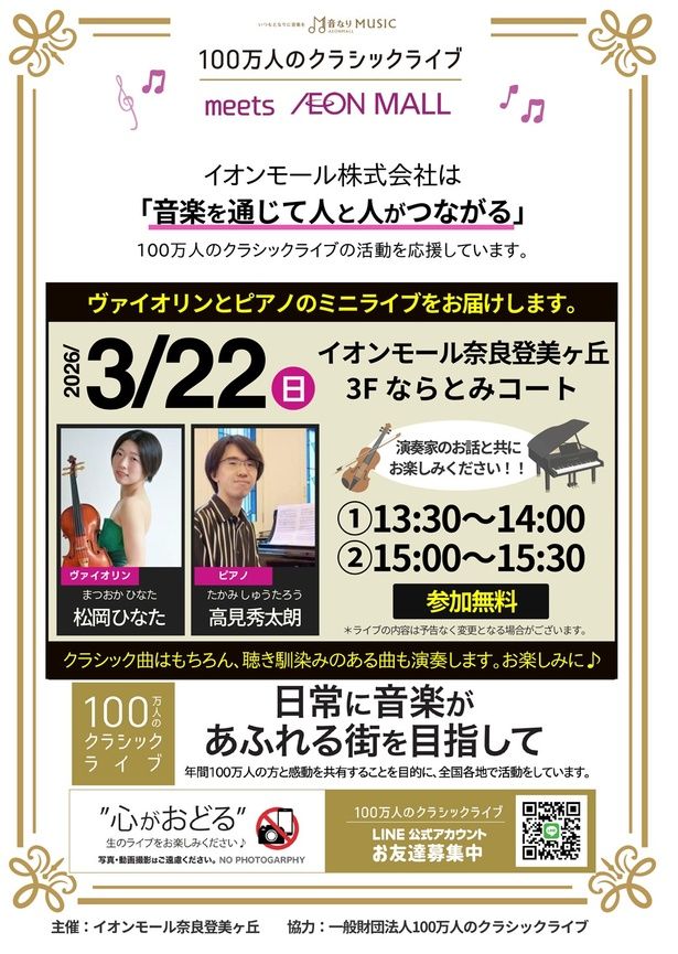 【100万人のクラシックライブ】イオンモール奈良登美ヶ丘 3Fならとみコート / 奈良県生駒市鹿畑町3027 / 2026年3月22日(日) / 13:30、15:00 / 入場無料