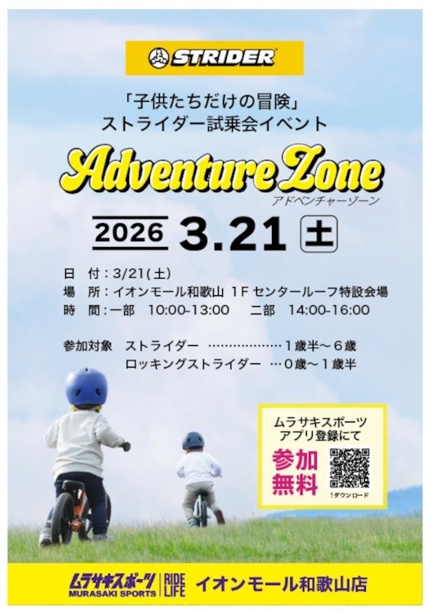 【「子供たちだけの冒険」ストライダー試乗会イベント アドベンチャーゾーン】 イオンモール和歌山 1Fセンタールーフ特設会場 / 和歌山県和歌山市ふじと台23番地 / 2026年3月21日(土) / (1)10:00~13:00、(2)14:00~16:00 / ムラサキスポーツアプリ登録にて参加無料 / 0歳から6歳まで