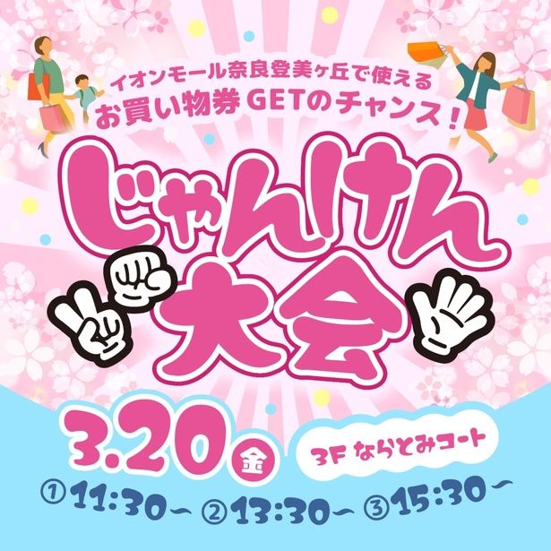 【じゃんけん大会】イオンモール奈良登美ヶ丘 3Fならとみコート / 奈良県生駒市鹿畑町3027 / 2026年3月20日(祝) / (1)11:30~、(2)13:30~、(3)15:30~ 会場入場時間(1)11:30まで、(2)13:30まで、(3)15:30まで / イオンモールアプリ会員限定