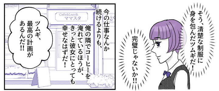 俺はノブト(23才)。大学を出てもどこかの企業に就職する気になれず、学生時代から続けているカフェのアルバイトで日々暮らしていた。フリーターの一人暮らしだから生活はカツカツだ。だけどやりたくもない仕事をするよりもマシだと思っていた。そんなある日、俺は「自分でカフェを開く」という夢にたどりついた。「やりたいことができたら応援する」と言ってくれていた彼女のツムギも、喜んで手伝ってくれるはず……! 俺の計画は完璧だった。