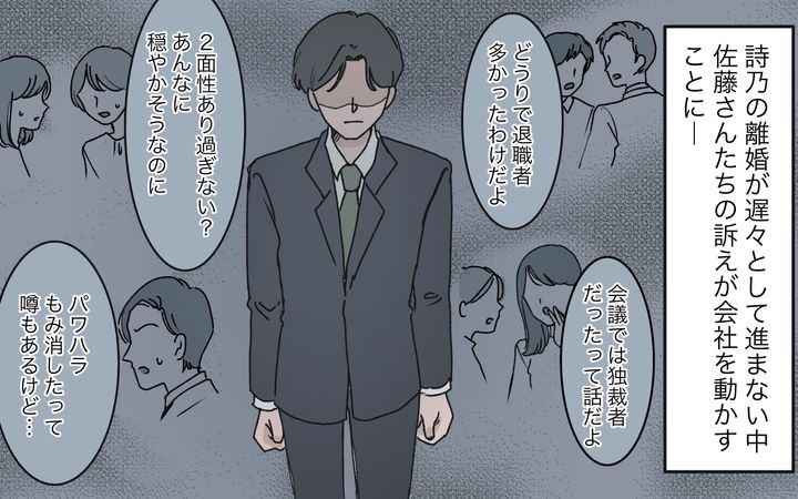 佐藤さんたちはパワハラ被害を訴える期限ギリギリで損害賠償請求をされたようです。魁人は詩乃との離婚については徹底抗戦の構えでしたが、佐藤さんたちからの訴えによって社内が揺れることになり…。魁人も詩乃との話し合いにだけ専念できなくなり、なんとか離婚まで持ち込むことができました。