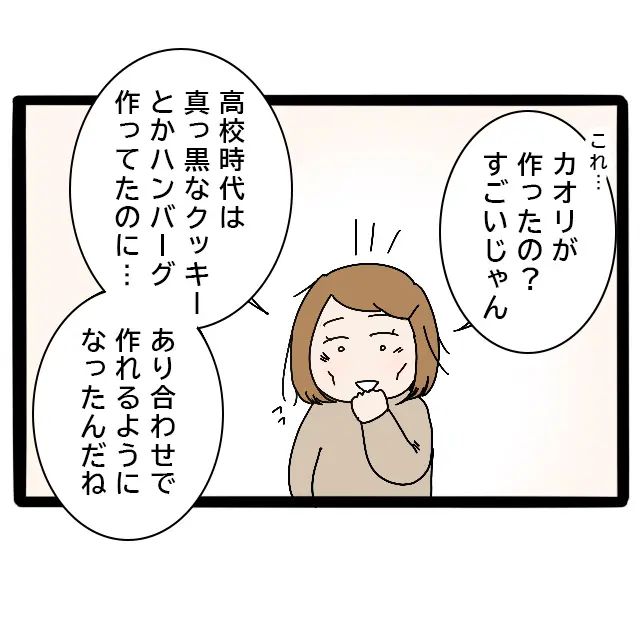 すると、みずほ先輩の表情がぱっと明るくなり、「これ、カオリが作ったの?すごいじゃん!高校時代は真っ黒なクッキーとかハンバーグ作ってたのに・・・あり合わせで作れるようになったんだね」と笑いながら褒めてくれました。