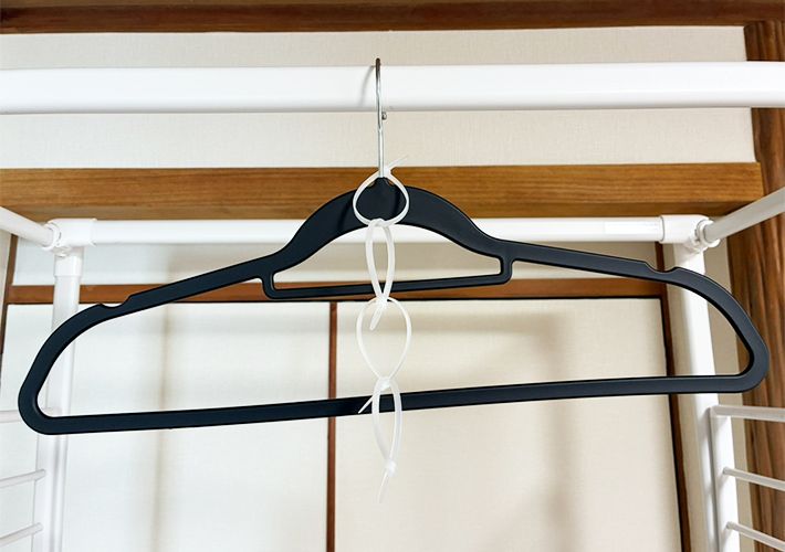 収納したい服をそれぞれハンガーにかけて、フック部分を結束バンドの輪っかに通せば完成!