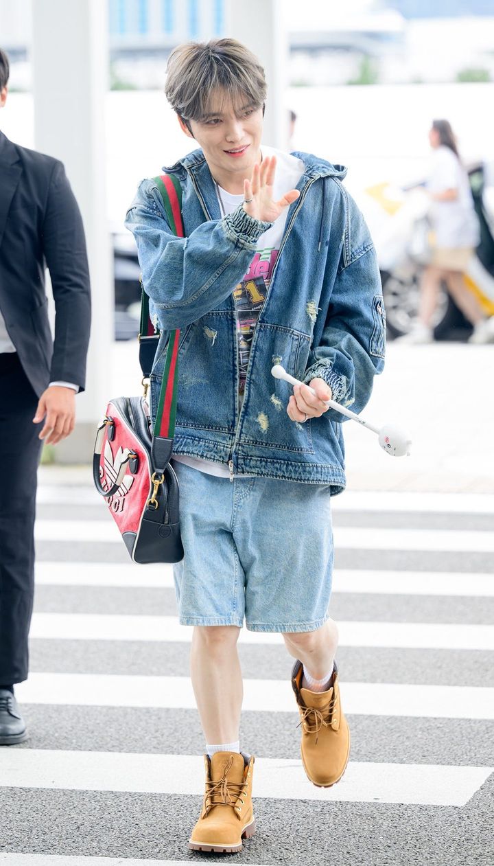 「2024 THE FACT MUSIC AWARDS」に出演するため大阪に向けて出発したジェジュンは、オーバーサイズのフーディにトレンドのハーフパンツを合わせた、デニム・オン・デニムコーデで登場。
