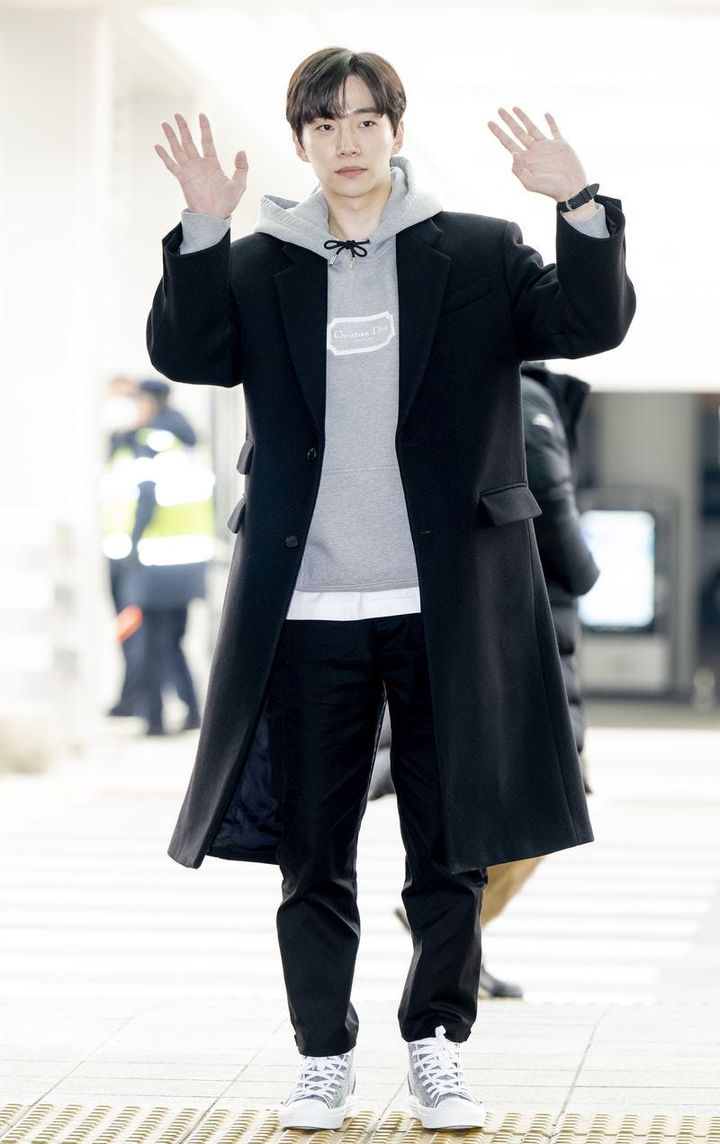 韓国ドラマ『赤い袖先』で俳優としても大ブレイクした2PMのジュノ。かわいい子犬のようなルックスに対して、2PMイチの“俺様”キャラなギャップが魅力のジュノですが、この日は素材の良さが光るスウェットコーデで、シンプルながらも洗練されたモテコーデを披露。2022年12月11日、仁川国際空港にて。名古屋で行われた「2022 Asia Artist Awards in Japan (AAA)」に出演するために来日。