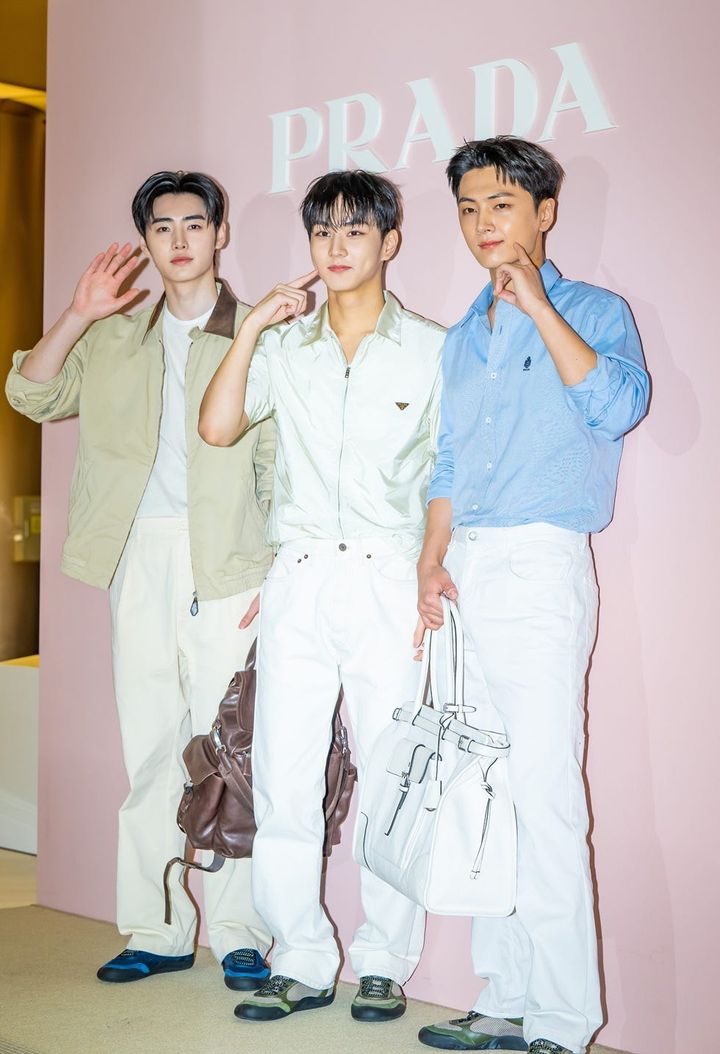 2026年3月12日、ソウルのロッテ百貨店アヴェニュエルにオープンしたPrada White Sunのポップアップイベントに、ジョンウォン、ソンフン、ジェイが出席。3人は白のパンツで揃えた爽やかな装いで現れました。
