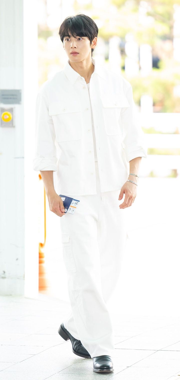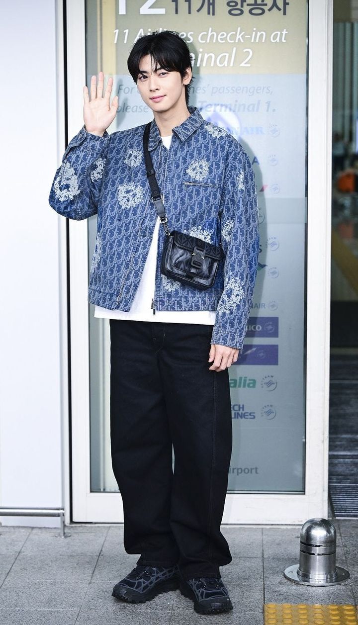 2023年6月21日、仁川国際空港を通じてフランス・パリへ出国したチャウヌ。ディオールの2024年夏メンズコレクションのショーに出席する予定で、この日は全身ディオールでコーディネートした空港ファッションを披露。白Tシャツにデニムジャケットを羽織ったカジュアルなナムチンルック(※)がチャウヌのクリーンな印象を引き立てます。