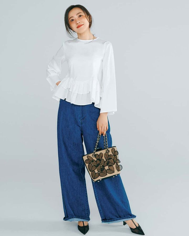 <写真1枚目>トップス¥15,400(アレア)パンツ¥4,990(ユニクロ)バッグ¥16,500(ダイアナ/ダイアナ 銀座本店)パンプス¥53,900(コルコバード/フィルム)