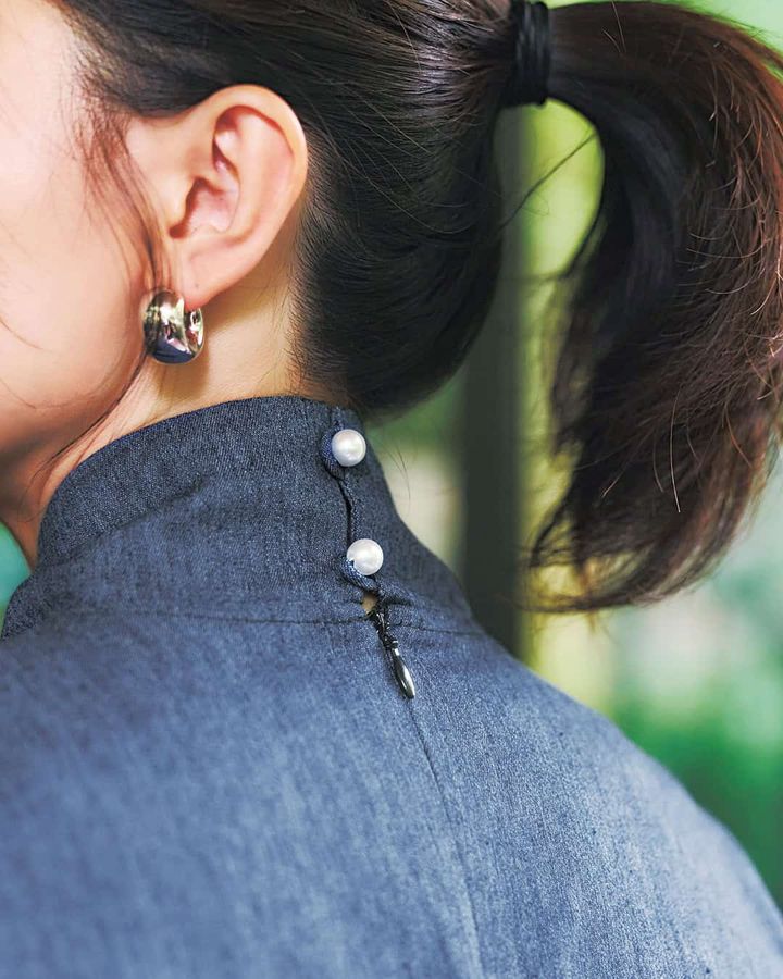 薄くて軽いデニム生地を使用しているので動きやすくストレスなく着られます。袖口のギャザーや衿元のパールなど甘派も取り入れやすいデニムブラウスです。