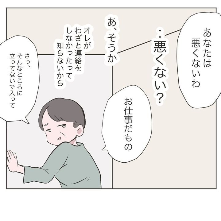 妻のSOSに気づけなかった夫。すぐに帰らなかったことに妻や義母は怒っているのでは? と不安な気持ちに。帰宅すると義母が出てきて…。