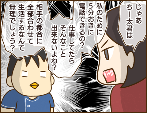 職場で出会った10歳年下の彼氏は、束縛気質がある様子。でん子が友だちと会っている時は、頻繁に連絡してきます。