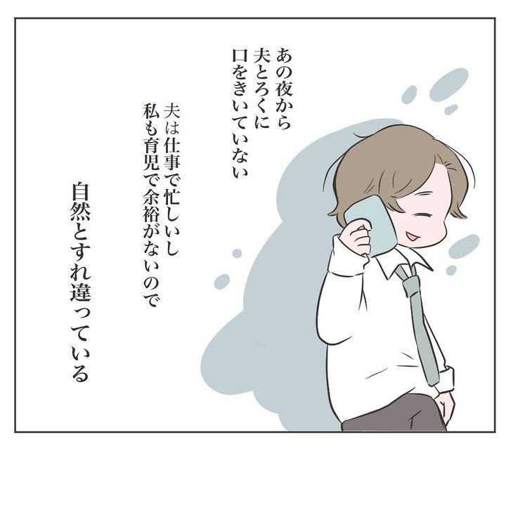 あの夜からろくに口をきいてない。夫は仕事で忙しいし、自分も育児で余裕がない。そして何より、心の余裕がない。夫と話をしたいと思いつつも、心が追い詰められてできませんでした。