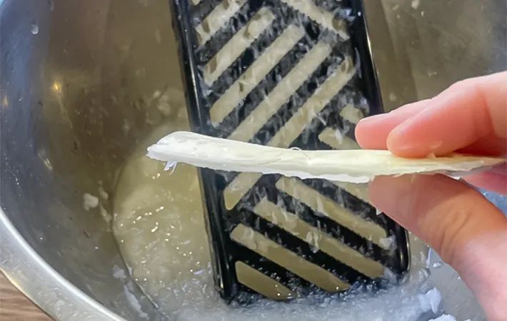 角があることで、丸い状態よりもおろし金に引っかかりやすく、軽い力でスムーズにおろせるんですよ。