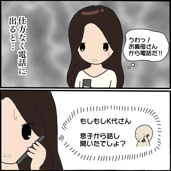 週末、義母の家を訪れたK代と夫。話を聞いた義母は、あろうことか夫と怖美の不倫関係を「ご縁」といって喜び、「怖美に会いたい」などと無神経な言動を繰り返すのでした。