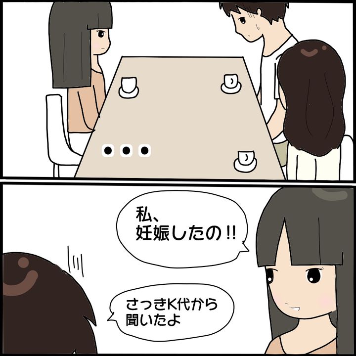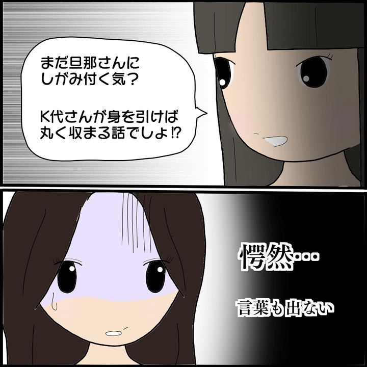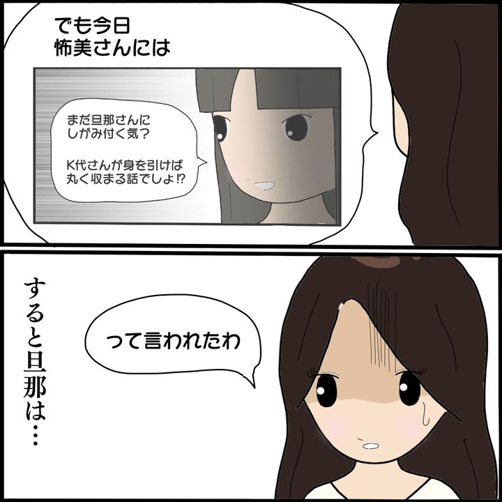 夫と別れるようせまる怖美を追い返そうとするK代。しかし怖美の口から妊娠の事実が飛び出すのでした。