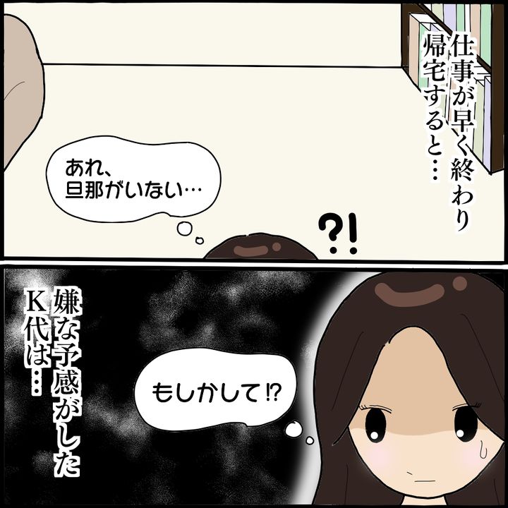 M子のアドバイスで、夫と話し合うことを決めたK代。単刀直入に怖美との関係をたずねると、夫の顔色が一気に変わります。