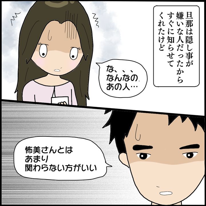 久しぶりに怖美と共通のママ友であるM子に再会したK代。これまで起きた話を全て話すと、M子の口から思わぬ事実が語られるのでした。