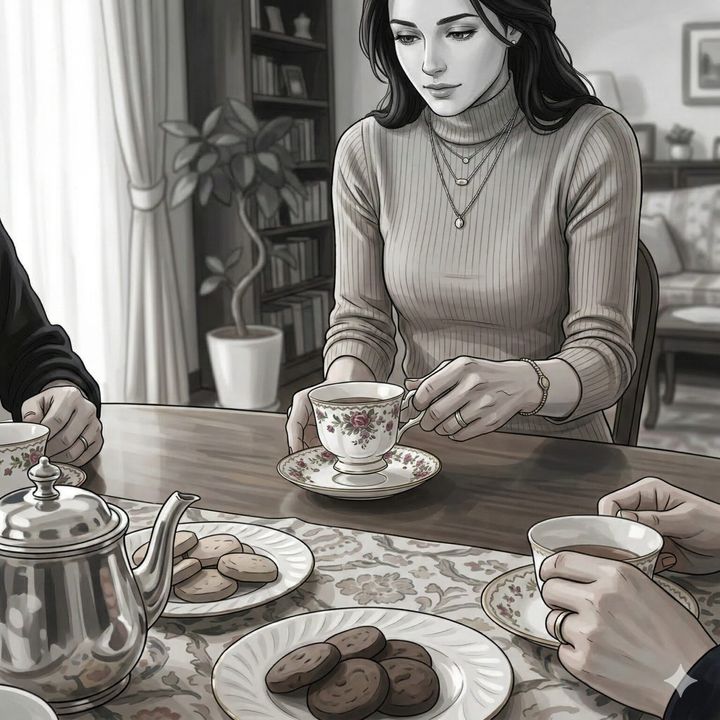 彼女が握るティーカップがソーサーにぶつかり、静まり返った空間に、焦りと恐怖を代弁するかのような陶器の音だけが不気味に響き渡ります。