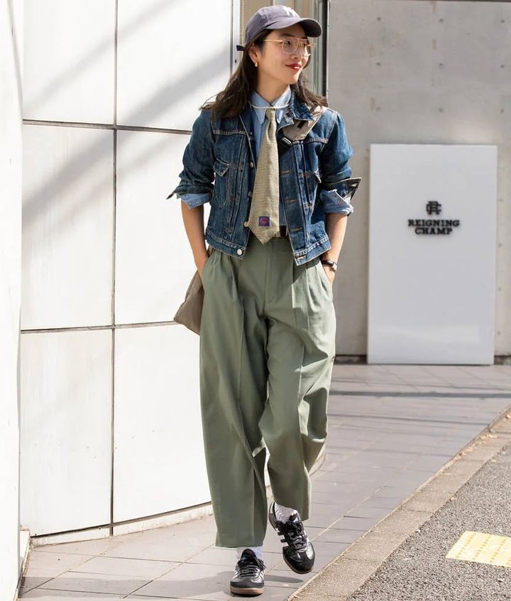 デニムジャケット×チノパンという王道ベーシックをネクタイで「らしく」昇華。トムボーイムードななかにもパールネックレスやメタルフレームのアイウェア、腕時計などで大人の品性を忍ばせて。