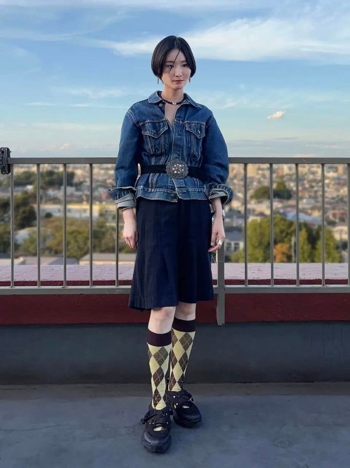 Aラインシルエットがユニークなデニムジャケットを主役に、シャツ、パンツも全て異なるカラーでデニム合わせにした上級者スタイル。自身に合ったサイズ選びが絶妙!
