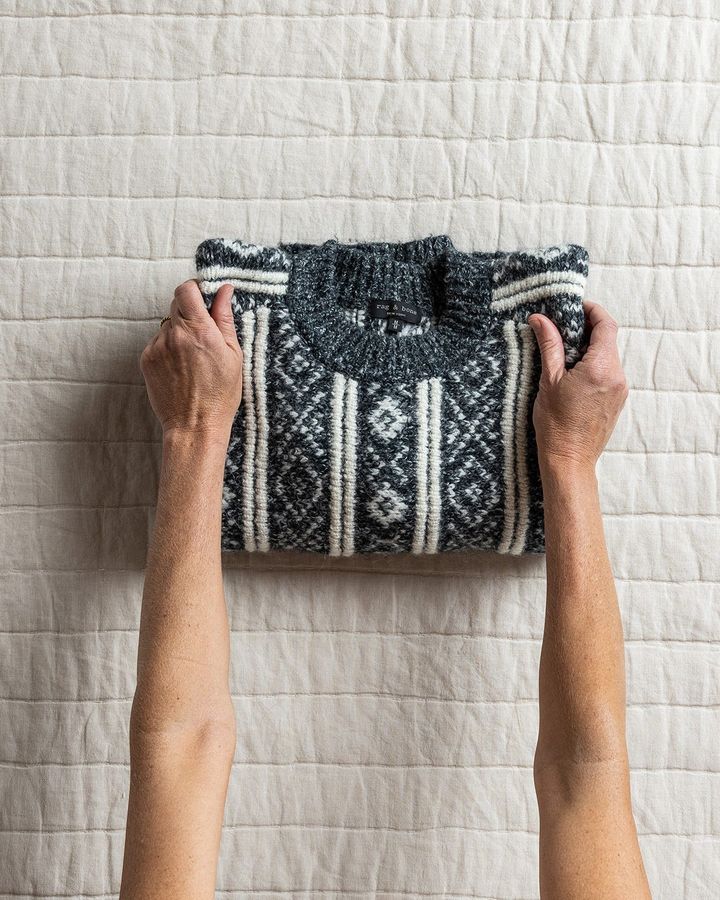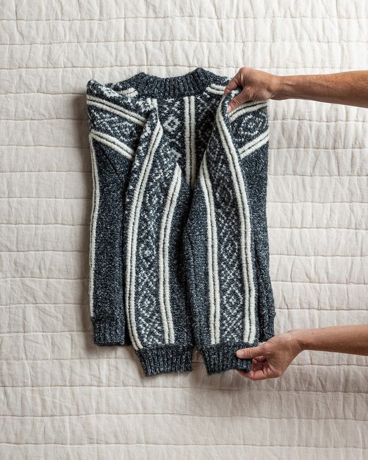 5. セーターの裾を持ち上げて、上に向かって半分に折る。これをもう一度繰り返して、四つ折りにする。