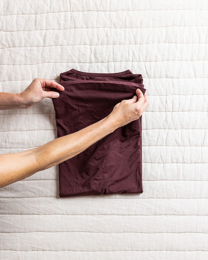 3. 片方の袖を胴体部分の内側に折りたたむ。次に、袖口が裾の近くに来るように袖を折り下げる。