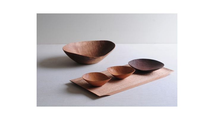 「リズミカルで程よいノミ目が美しく心地良い、杉村さんの木工作品たち。代名詞のスツールは、お尻にぴたっとはまり、またインテリアとしても美しい。色々な木目やサイズから選べるのは個展ならではです。すっきり美しいトレイはお茶の時間に欠かせません。人気の『壁の棚』や箱もご覧いただけます。ダイニングテーブルやダイニングチェアーなど家具のご注文も承ります。お気軽にご相談ください」(宙 店主)