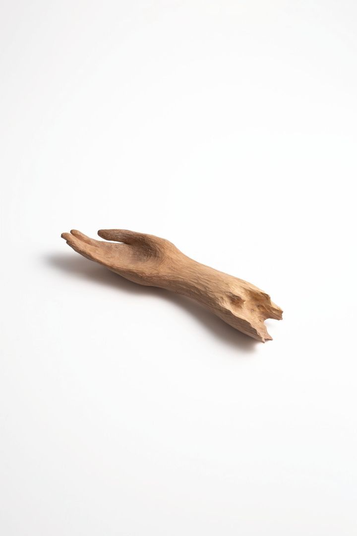「岸野承さんは大学で彫刻を学んだ後、石彫・鋳造などの仕事を経て、現在の古木を用いた作品の制作に取り組まれました。岸野さんの作品のモチーフには人や鳥が多く見られますが、意図して人や鳥の姿をただ写し取ろうとするのではなく、寺や神社から譲り受けた古材や海岸に流れ着いた流木、境内に埋もれていた古瓦など、さまざまな素材に寄り添い、素材が示す姿形を感じとっていく時間が大切になるのです。それは無いものを感じて空間を彫りあげていく、まさに彫刻しているモノと一体になる無心の境地であり、私達が岸野承さんの作品に仏様や暖かなモノを感じる所以でもあります」(寺田美術 店主)