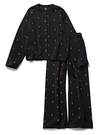 黒刺しゅうカーディガン 57,200円、黒刺しゅうパンツ 63,800円/ともにBATONER 伸縮性が高く、リラックスした面持ち。地味でも派手でもない植物の刺しゅうで、少しの遊び心を。