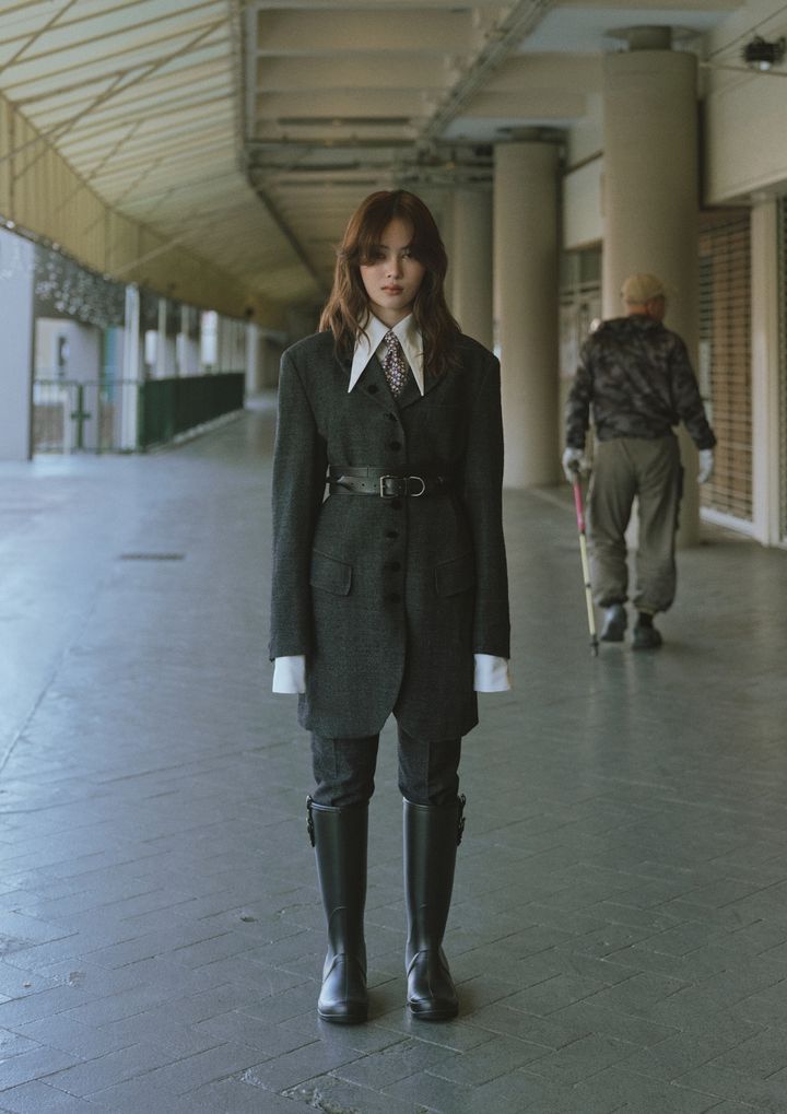jacket and trousers by COMME des GARÇONS HOMME PLUS, shirt by SHIORI MIKATA,boots by CHLOE, tie and belt stylist’s own