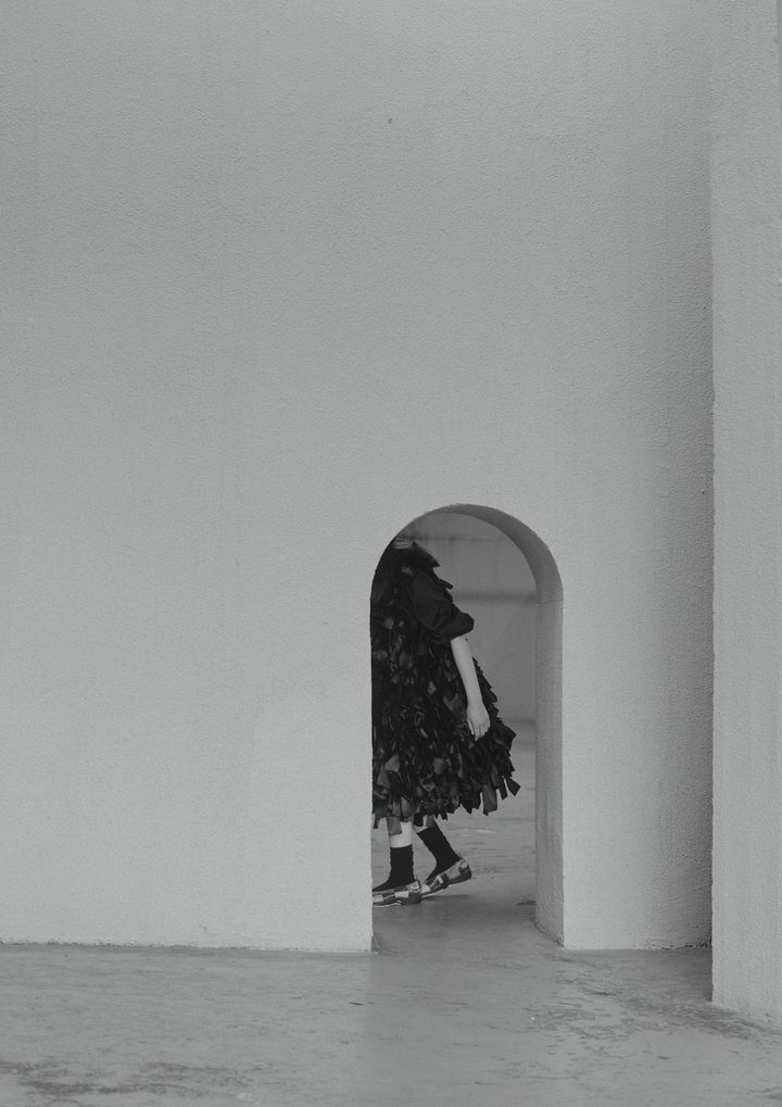 dress by ANNREO, shirts by LEMAIRE, shoes by LEEANN HUANG, socks stylist’s own