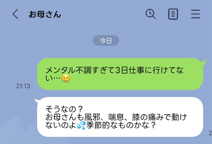 「不調で仕事を3日休んでいる」と、実母にLINEをしたら「お母さんも風邪」「喘息、ヒザの痛みで動けない」と返信が来たという、投稿者さん。投稿者さんは、メンタルが不調で「仕事を連日休んでいた」といいます。実母は心配してくれるかと思いきや、返ってきたのは、自分の体の不調の話でした。他のママたちの実母は、こんな時どんな返事が来るのか知りたいそうです。
