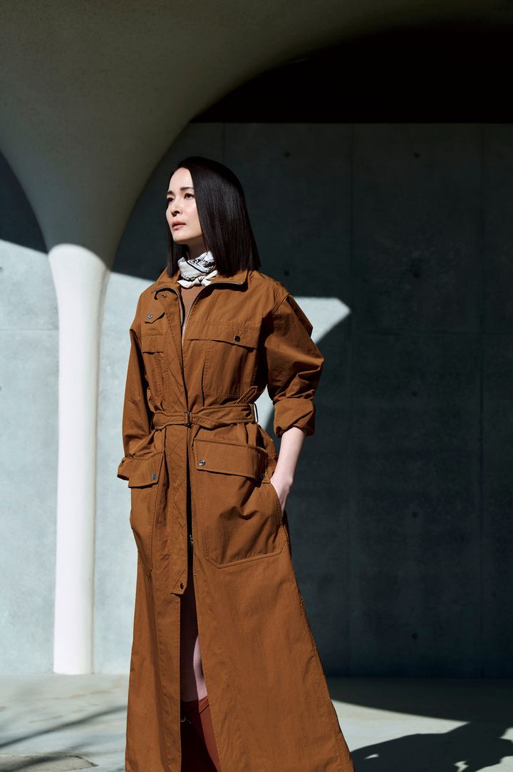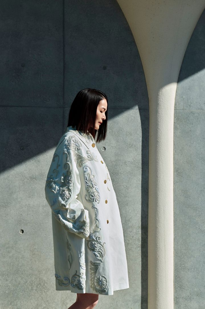デザイン性がより高まった今季のコレクション。そのなかで日常に取り入れたいのが、オフホワイトのコットンに、ビーズを贅沢に用いた同色のマタドール刺繡を施したコート。優しい素材感や丸みを帯びたシルエットがやわらかな雰囲気ながら、光を受けると刺繡が浮き上がり、手仕事の温もりある美しさが高揚感を誘います。華美になりすぎないこの“余白のある華やかさ”こそ、いまの気分にフィット。巧みな素材使いで表現した、完成度の高い一着です。