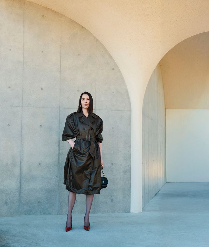 男性の服を女性のために再解釈し続けてきた「サンローラン」にとって、トレンチコートは強さと官能性を表現し、理想の女性像を語るアイコンです。今季は非常に軽く光沢感のあるナイロン生地をAラインのオーバーシルエットに仕立て、コンサバティブなイメージを払拭。時代が求める、カジュアルでエッジィなスタイルへと更新しました。ウエストのリボンベルトは首に巻いても素敵。いっそう華を添える赤いパンプスもポイントです。