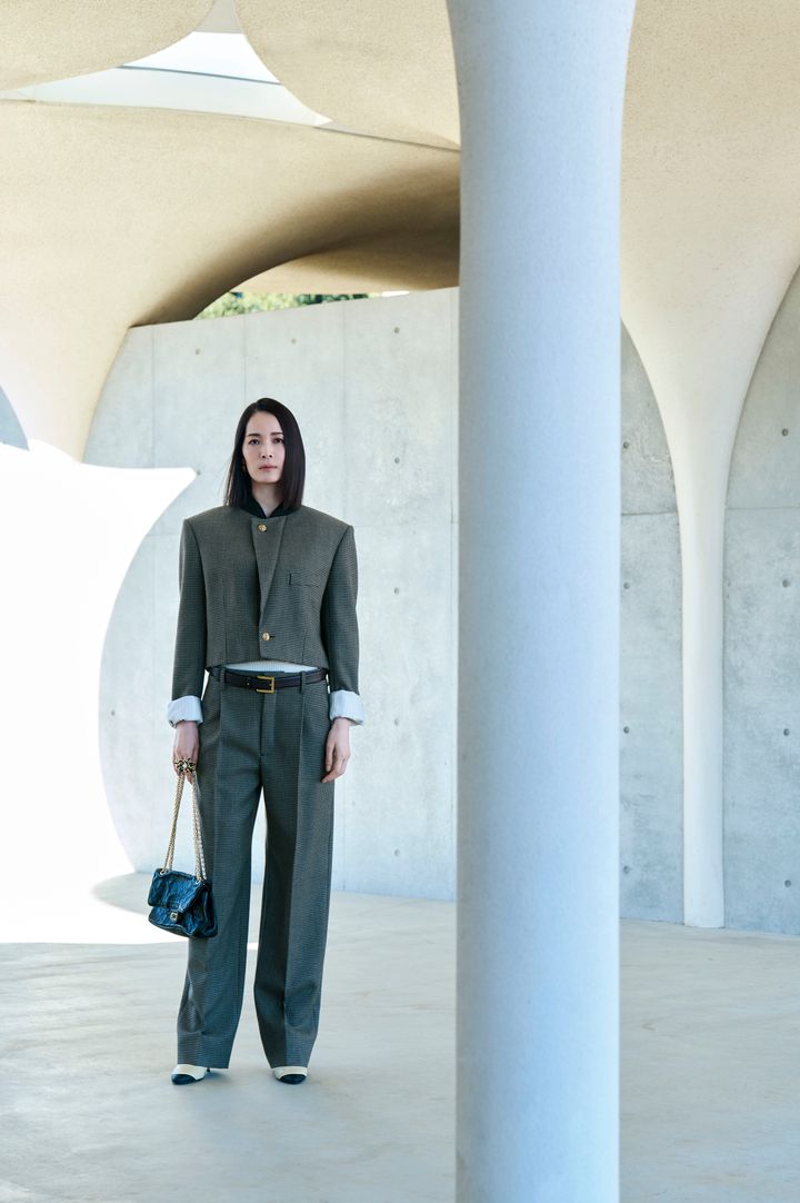 切りっぱなしの仕立てとクロップド丈によって大胆かつスポーティに変貌し、イメージを刷新した「シャネル」のスーツ。腰ばきのマニッシュなパンツからニットのトランクスをあえてのぞかせた着こなしも、クラシックでありながらアバンギャルド。ひとつのスタイルにとらわれない、自由で革新的なエレガンスに満ちています。袖の裏地やパンツのベルト通しにさりげなく“ダブルC”があしらわれているなど、細部までのこだわりも見逃せません。