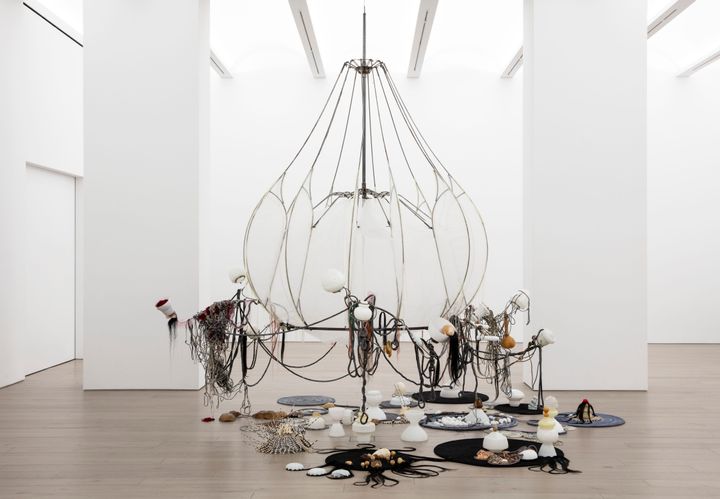 中でも、高さ約7メートルの記念碑的インスタレーション『In an unnatural storm a world fertile, fragile and desirous, polluted with excess pollination...』(2008年)や、人毛の国際取引に着想を得た『Black Noodles』(2023年)は見逃せない。