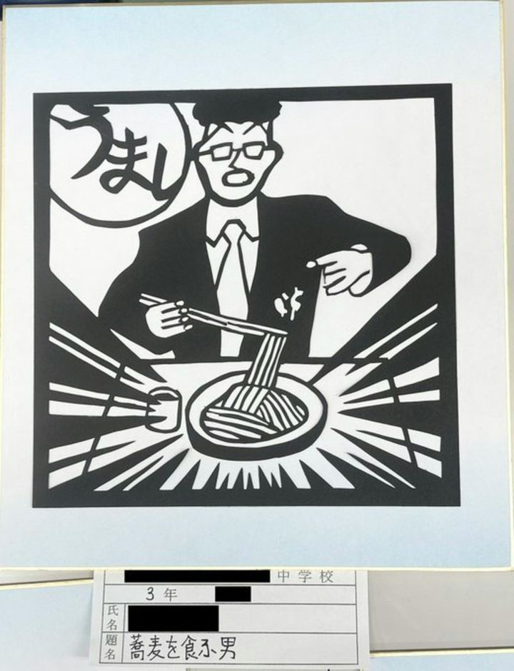 息子さんの作品のテーマは「蕎麦を食ふ男」。タイトルも良いですね。しかも作品自体の勢いもすごく良い!名所でもお寺でもなく…修学旅行の食の思い出を全力で表現した作品なのですね。とてもインパクトの強い作品で、息子さん、切り絵の才能ありそうです。