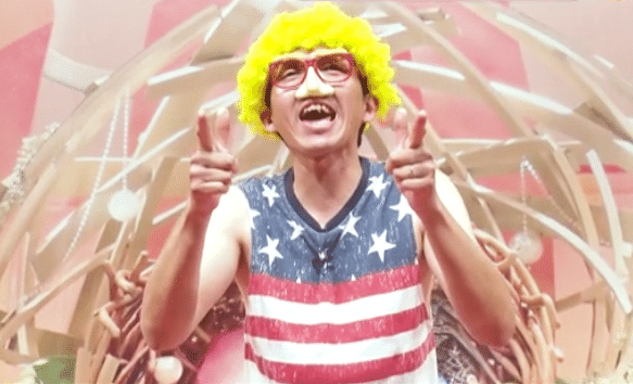 ということで「きっしー」に扮して登場してもらうと、夫の人格も豹変! アメリカ国旗の衣装に金髪パーマのいでたちで、ハイテンションキャラに早変わり…。