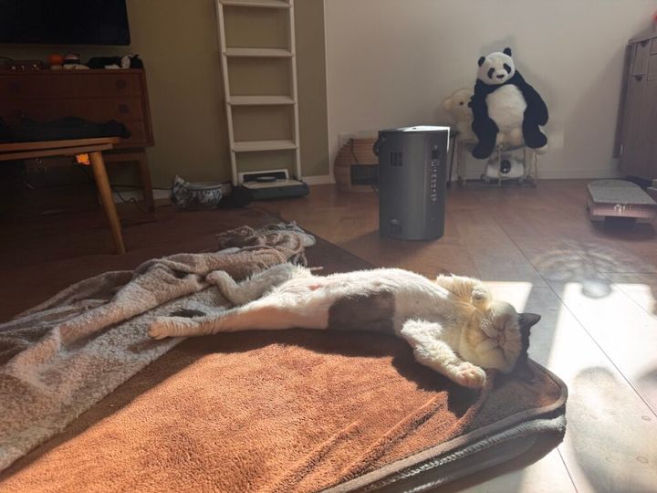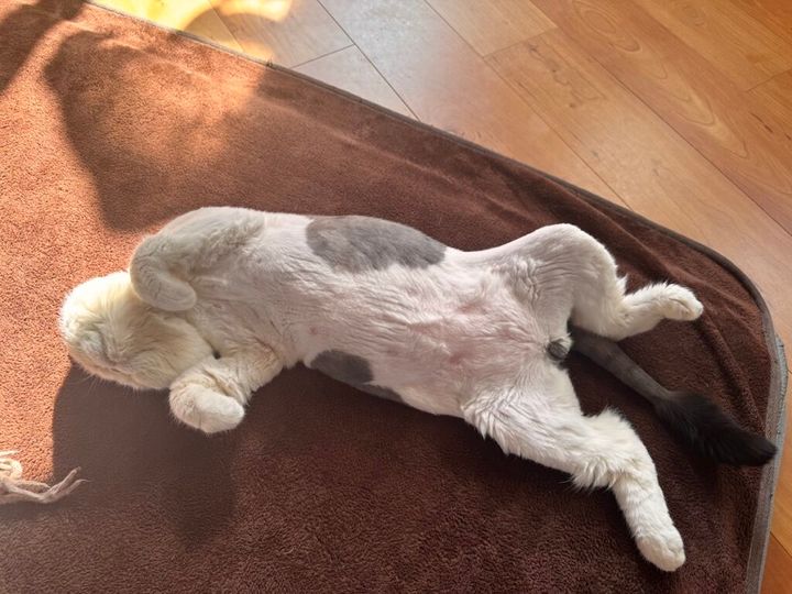 気持ち良くて、こんなポーズになっちゃった。お腹でもお日さまをたくさん浴びたいの。