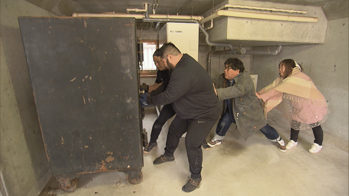 金庫は1階にあり、高さ170㎝、横幅110㎝、奥行き90㎝で、下にキャスターはあるが前後にしか動かない。もちろん竹山が押してもびくともせず。そこで、以前番組に出演してくれた力持ち2人を招集。が、さすがの2人も「参りました」。ならば4人でと動かしてみれば、ようやく後ろの壁との間に隙間が!しかし、前に出すと給湯器があるため、横に出さないといけない。というわけで、建築現場で活躍するという専門職「重量屋さん」に連絡をとり…。驚異の働きを見せた「重量屋さん」とは一体、何者なのか!?