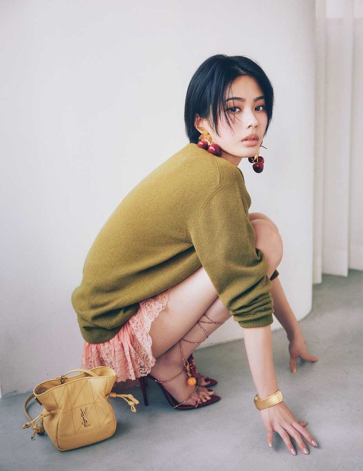安斉星来。ar3月号より ニット¥277,200、ショートパンツ¥611,600、サンダル¥627,000(参考価格)、バッグ¥352,000、イヤリング¥324,500(参考価格)、バングル¥181,500(参考価格)/サンローラン バイ アンソニー・ヴァカレロ(サンローラン クライアントサービス)