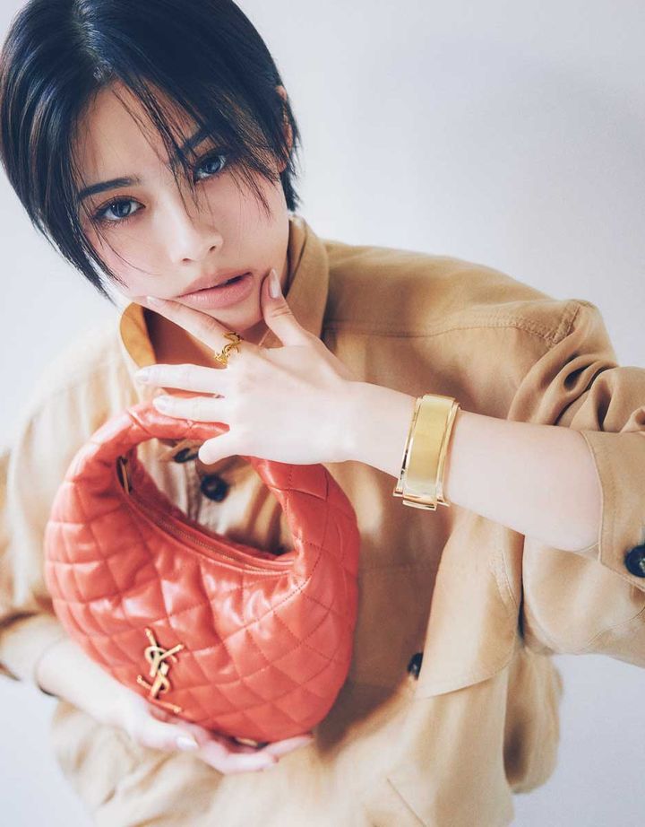 安斉星来。ar3月号より ブルゾン¥533,500、バッグ¥456,500、バングル¥181,500(参考価格)、リング¥52,800/ サンローラン バイ アンソニー・ヴァカレロ(サンローラン クライアントサービス)