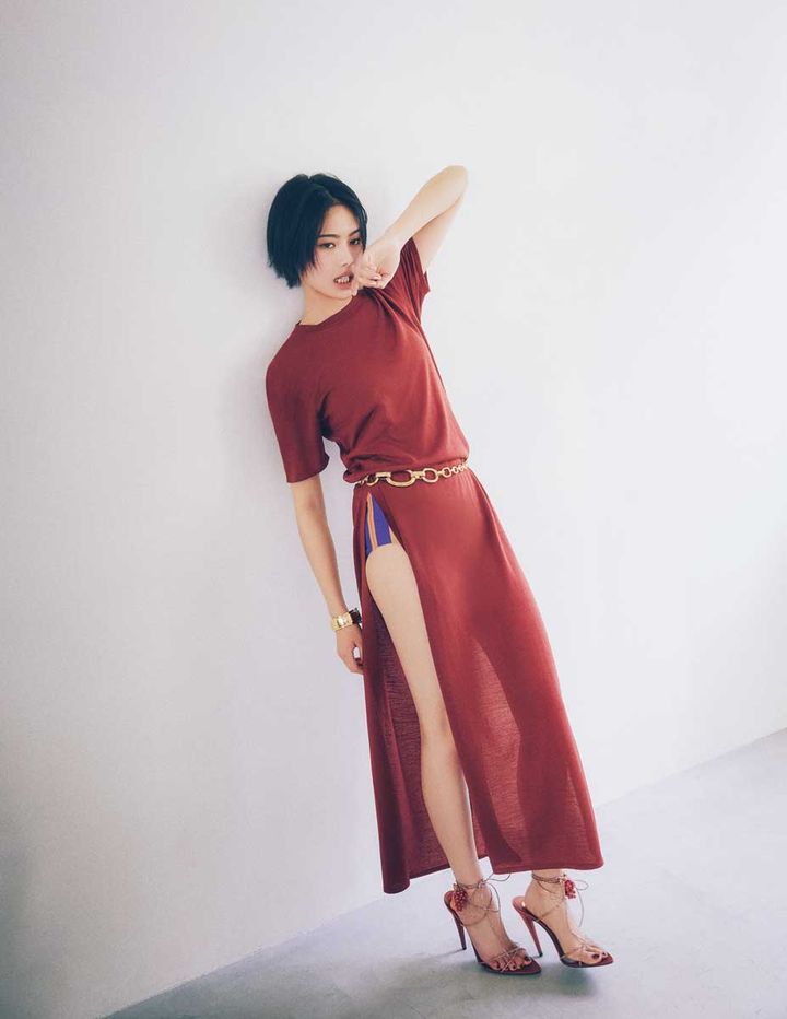 安斉星来。ar3月号より ニットドレス¥407,000、ショーツ¥110,000、ベルト¥407,000、サンダル¥627,000(参考価格)、バングル¥181,500(参考価格)/サンローラン バイ アンソニー・ヴァカレロ(サンローラン クライアントサービス)