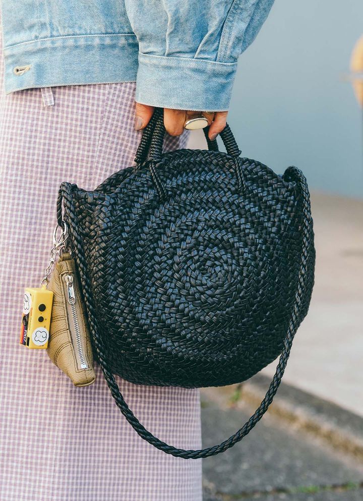 『アエタ』のバッグは編み込みバスケットで、季節感をキャッチ。クロワッサン風のポーチやミニカメラを提げて、遊び心をオン!