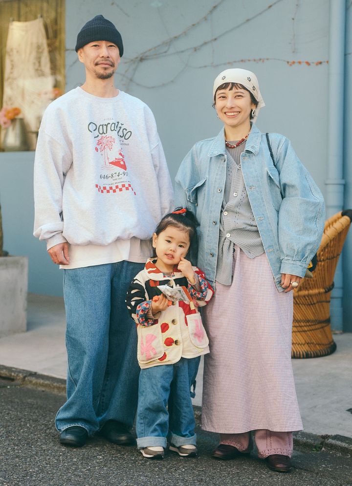 定番デニムは明るめブルーをセレクトして、春らしく着こなしたファミリーコーデ。ママパパの明るめトーンで揃えたのに対して、キッズのパッチワークジャケットが挿し色にぴったり。まだ肌寒い日が続き、ジャケットがマストなこの季節に、ぜひ参考にしたいスタイリング♪